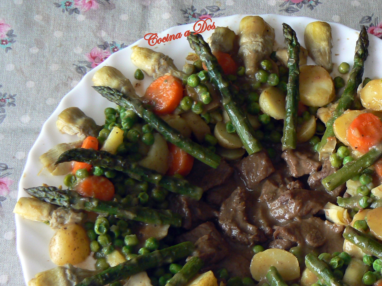 Adornar con las alcachofas al rededor, los espárragos, los guisantes, la zanahoria y las patatas.